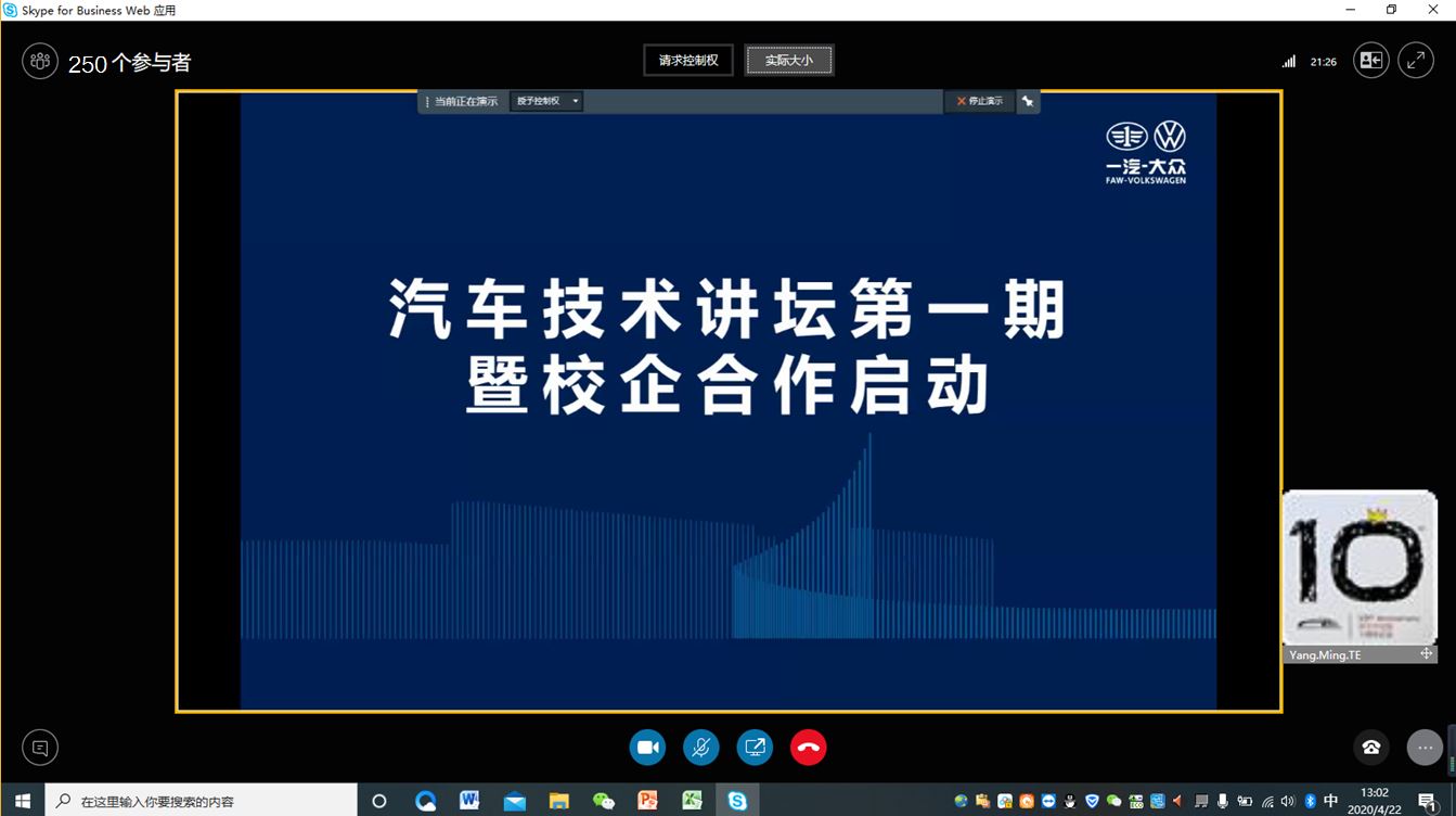 4月22日,av在线 与一汽-大众汽车有限公司合作举办的汽车技术讲坛在线上开讲。汽车仿真与控制国家重点实验室曾小华教授进行了主题为《节能与新能源汽车技术进展》的讲座。一汽-大众有限公司技术研发部李丹总监、黄杰书记,av在线 高振海院长、雷雨龙副院长参加线上启动仪式。一汽-大众有限公司技术研发部260名员工在线上参加讲座。