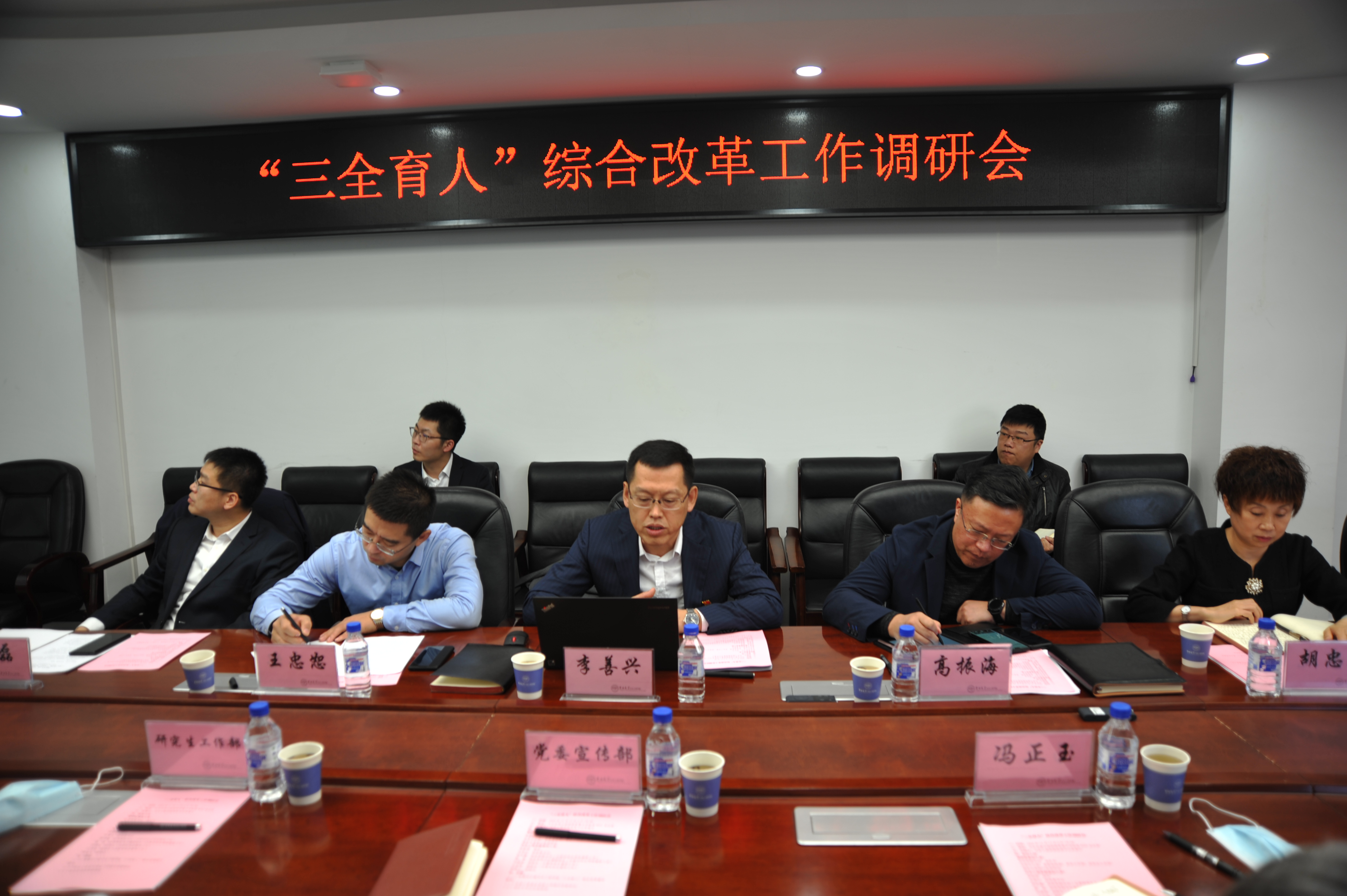 李善兴书记代表学院党委对学院的“三全育人”综合改革工作进行了汇报。他从“课程育人重思政”“科研育人重协同”“实践育人重平台”“文化育人重风尚”“网络育人重阵地”“心理育人重帮扶”“资助育人重精准”“组织育人重创新”“管理育人重服务、服务育人重管理”等十个方面进行了汇报,对“三全育人”综合改革工作存在的问题以及下一步的工作提出了具体的举措。学院领导班子成员结合工作实际和自己的感悟与各部门负责人进行了积极地交流。