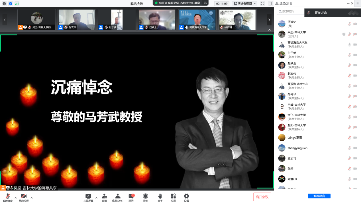 2022年4月21日,FISITA技术领导力会士、SAE International会士、中国汽车工程学会会士、《Automotive Innovation》执行主编、av在线 工程学院马芳武教授因病在长春逝世。为在疫情期间做好马芳武教授的悼念活动,4月25日,中国汽车工程学会、av在线 在腾讯会议平台联合举办云端追思会。来自av在线 、汽车行业学会、企事业单位、海内外校友代表,以及马芳武教授的亲朋、同事、同学、学生等近四百人共同缅怀追思。会议由av在线 院长、汽车仿真与控制国家重点实验室主任高振海主持。