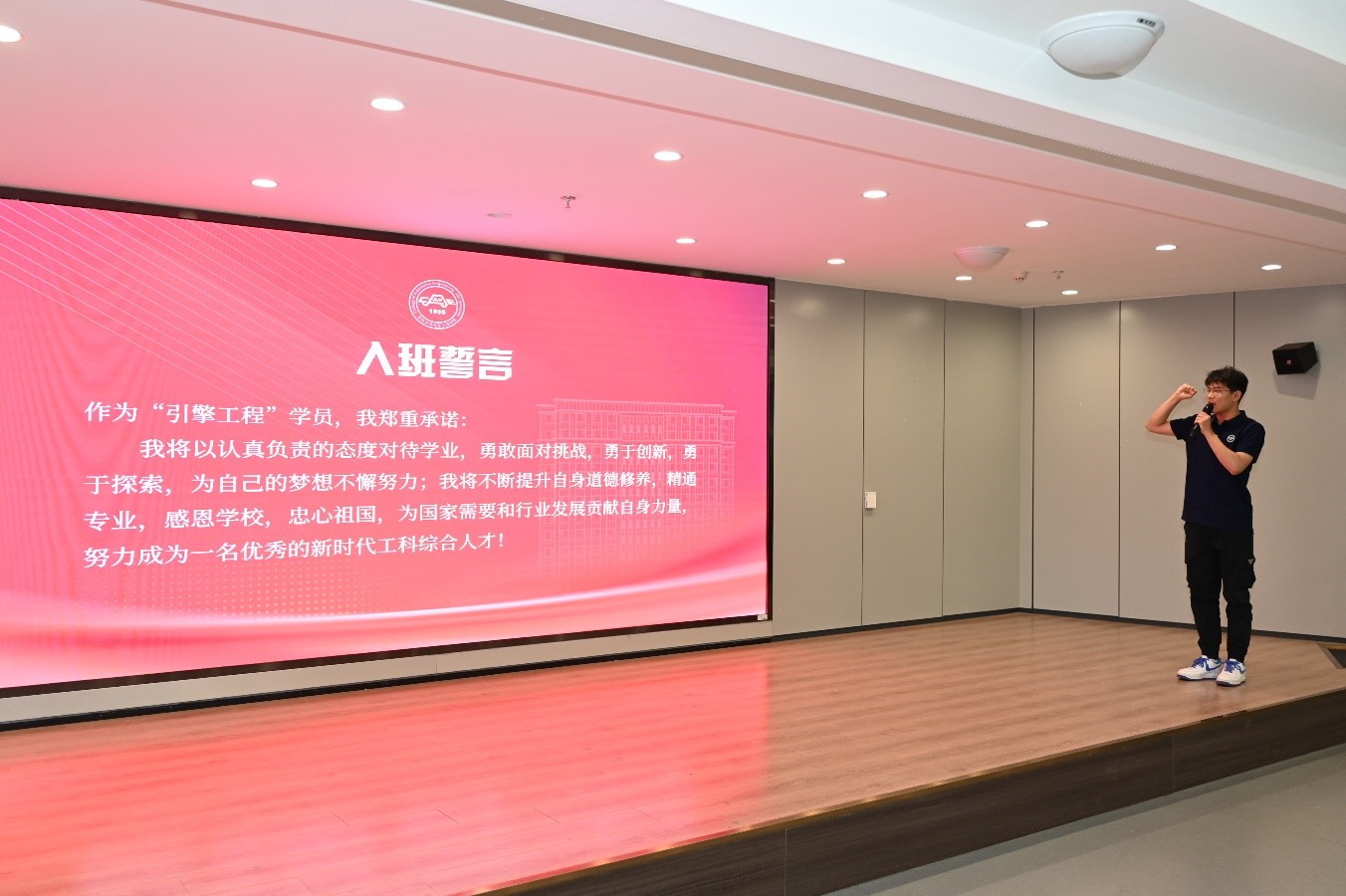 “引擎工程”优秀学生培养计划全体学员进行入班宣誓。庄重承诺将精通专业,感恩母校,忠心祖国,为国家需要和行业发展贡献自身力量。