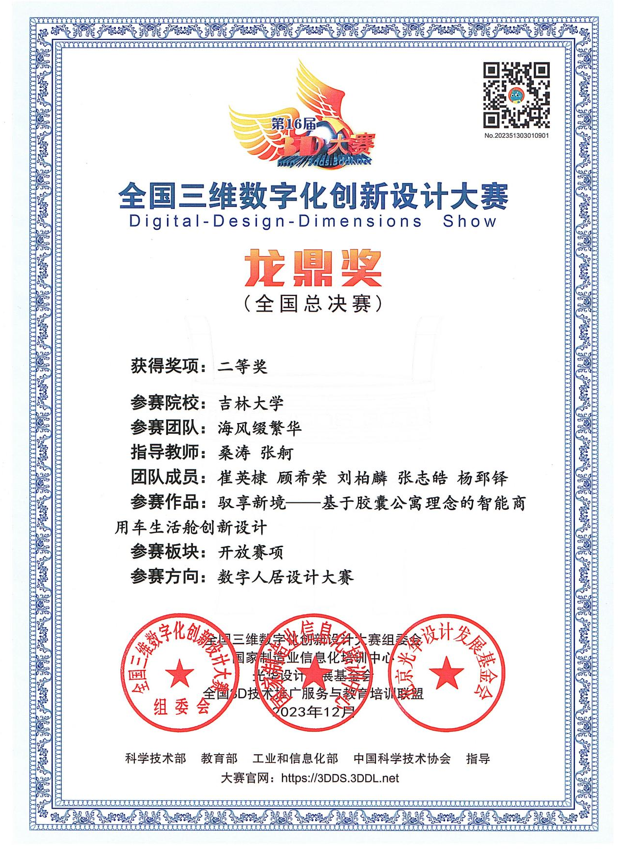 为深化新工科的建设与改革,培养学生的创新设计能力与团队合作意识,av在线 车身系桑涛教授带领2022级设计学硕士研究生崔英棣、2023级硕士研究生张志皓及2022级本科生杨郅铎与艺术学院设计系张舸教授及2022级硕士研究生顾希荣、刘柏麟合作组建“海风缀繁华”参赛团队,参加了2023年第16届全国三维数字化创新设计大赛(简称:全国3D大赛)。