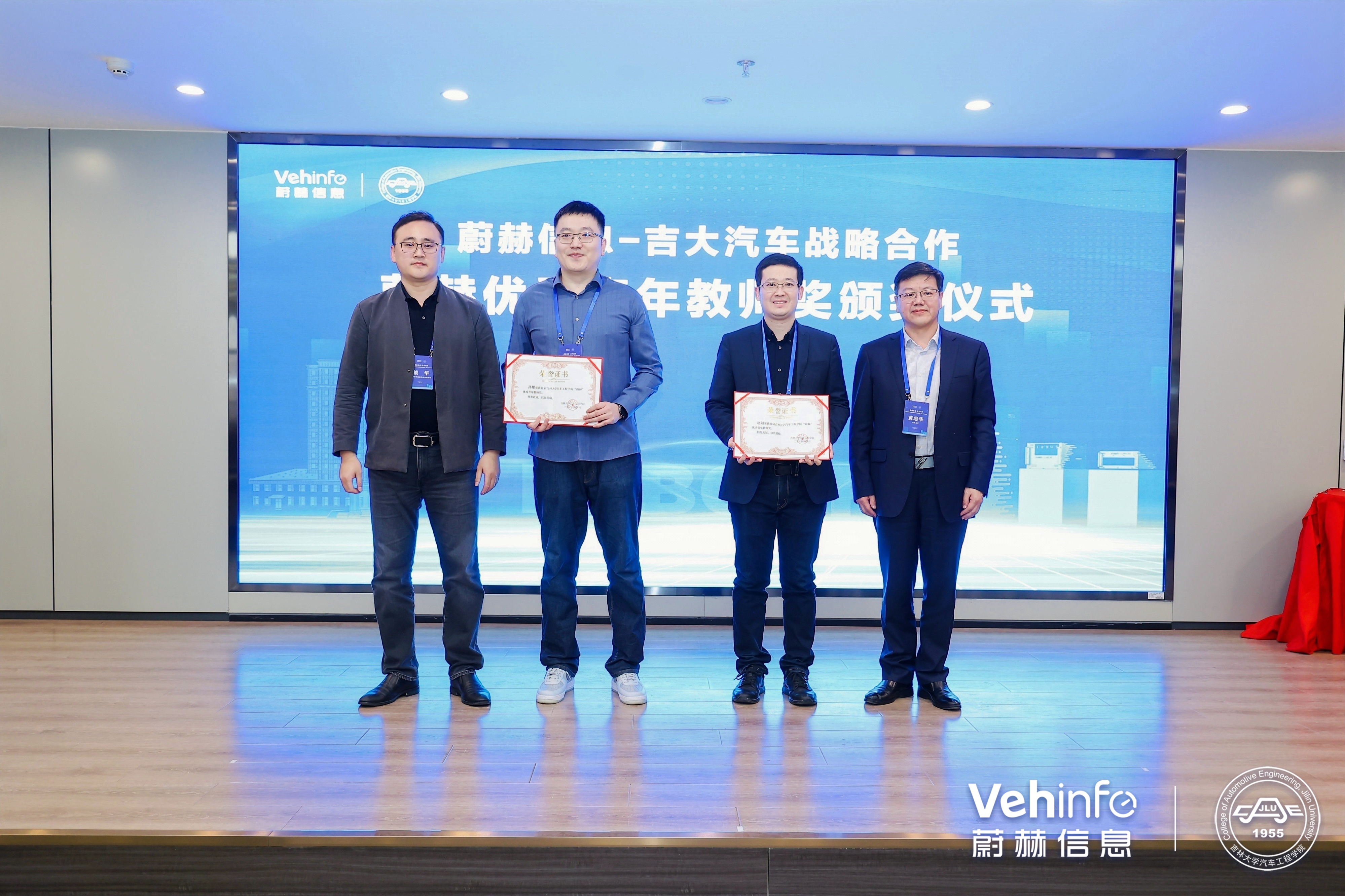 学院副院长王忠恕与蔚赫信息副总经理虢华为吉大蔚赫联合试验室揭牌;学院党委书记黄忠华与蔚赫信息副总经理虢华共同为学院获得“蔚赫”优秀青年教师奖的两位教师颁发荣誉证书。