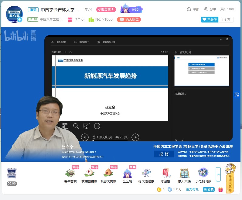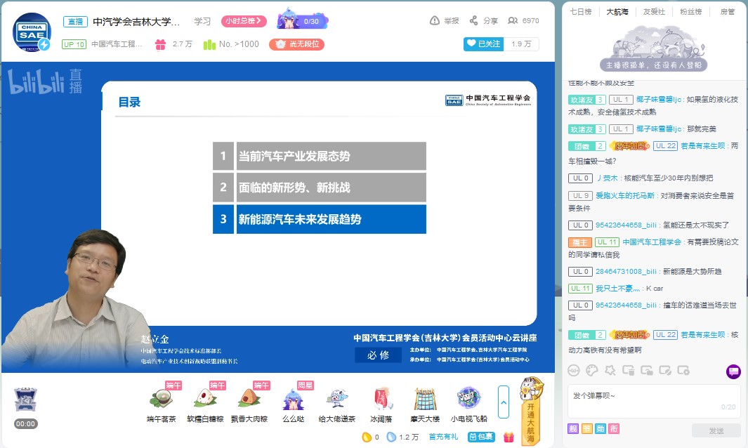为帮助学生拓展视野,明确发展方向,树立正确的就业观。6月18日下午,由中国汽车工程学会、av在线 主办,中国汽车工程学会(av在线 )会员活动中心承办的“新能源汽车发展趋势”云讲座在bilibili“中国汽车工程学会”的直播间进行。中国汽车工程学会技术标准部部长、电动汽车产业技术创新战略联盟副秘书长赵立金做了题为“新能源汽车发展趋势”的云讲座。讲座由av在线 学生工作办公室主任吴昊主持。