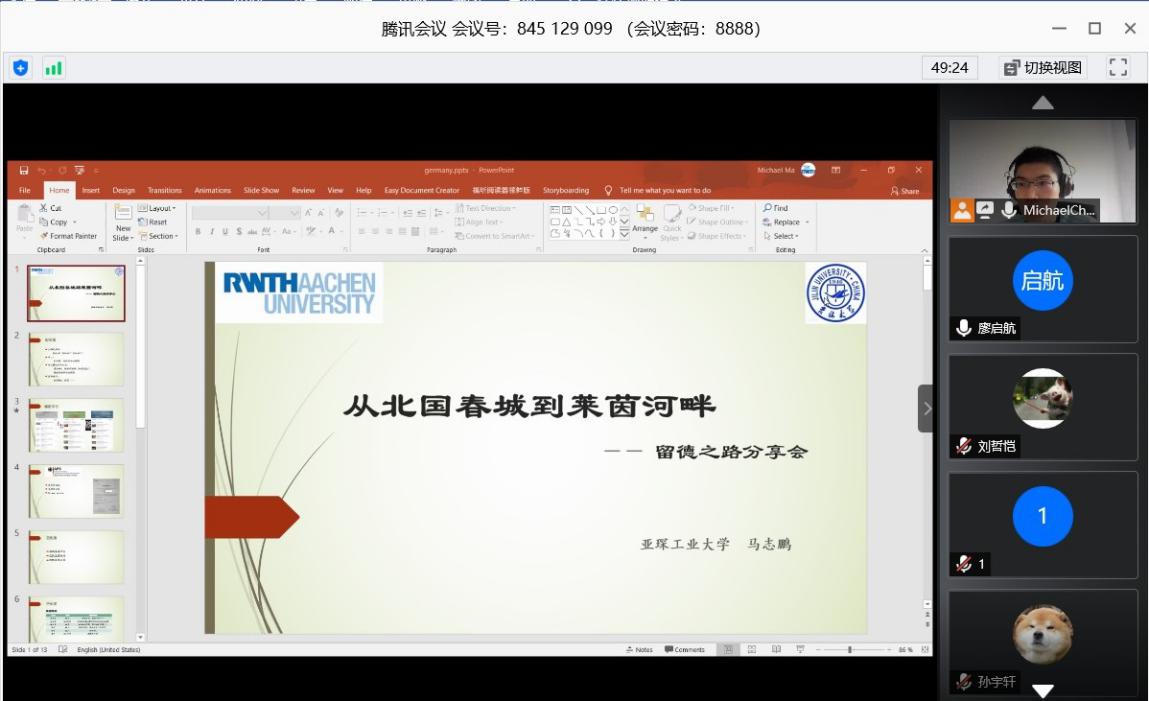av在线 优秀毕业生马志鹏学长为同学们带来“从北国春城到莱茵河畔”为主题的留德分享会。马志鹏目前就读于德国亚琛工业大学机器人系统工程专业,他从德国留学申请阶段和德国留学生活、学习阶段两个方面进行了经验分享、细致讲解,为计划留学深造的同学们明确了努力方向。