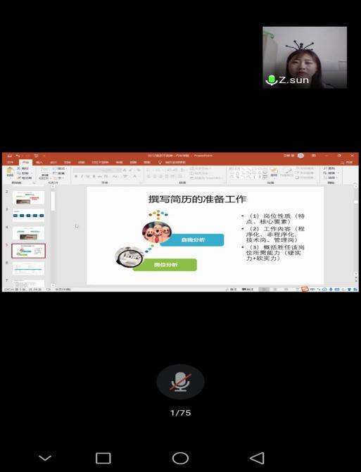 就业指导课学习,提高理论战斗力。辅导员吴昊老师通过就业指导课,指导学生建立自己的就业计划与职业规划,并邀请相关领域专家进行讲解,解决同学们就业过程中面临的问题。指导学生参加学校首届视频简历大赛,通过录制个人视频简历,反复锤炼自我介绍,提高学生制作简历能力、语言表达能力,提高就业所需掌握的技能,真正做到“让你的简历会说话”。同时,我院陈轶然、胡沁清、王鑫煜、崔笑仙四名同学在此次比赛喜获佳绩。